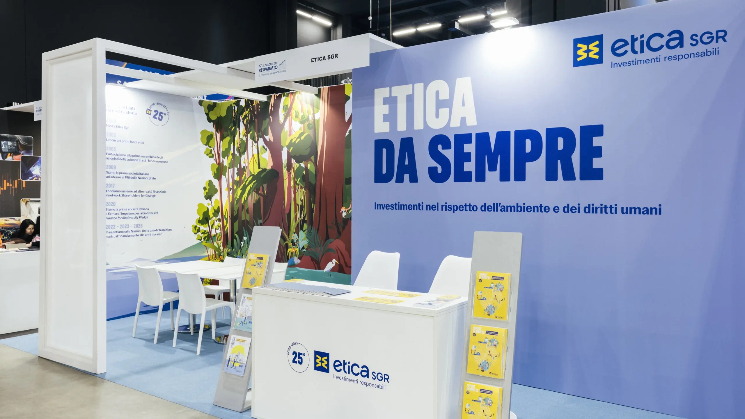 Il tema dell’anno per Etica Sgr è la biodiversità, una delle opportunità di investimento più promettenti per il futuro e legata, molto più di quanto si possa pensare, ai temi della salute e del progresso. Per rappresentare la grandezza e la bellezza di flora e fauna è stato scelto di occupare gran parte dello spazio disponibile con un’immensa illustrazione, commissionata a Giordano Poloni. La grafica dello stand festeggia anche l’anniversario dei 25 anni di Etica Sgr, attraverso un logo disegnato ad hoc ed una linea del tempo che ne celebra le tappe fondamentali. Il resto della grafica richiama invece la campagna istituzionale dell’anno, Etica da sempre.