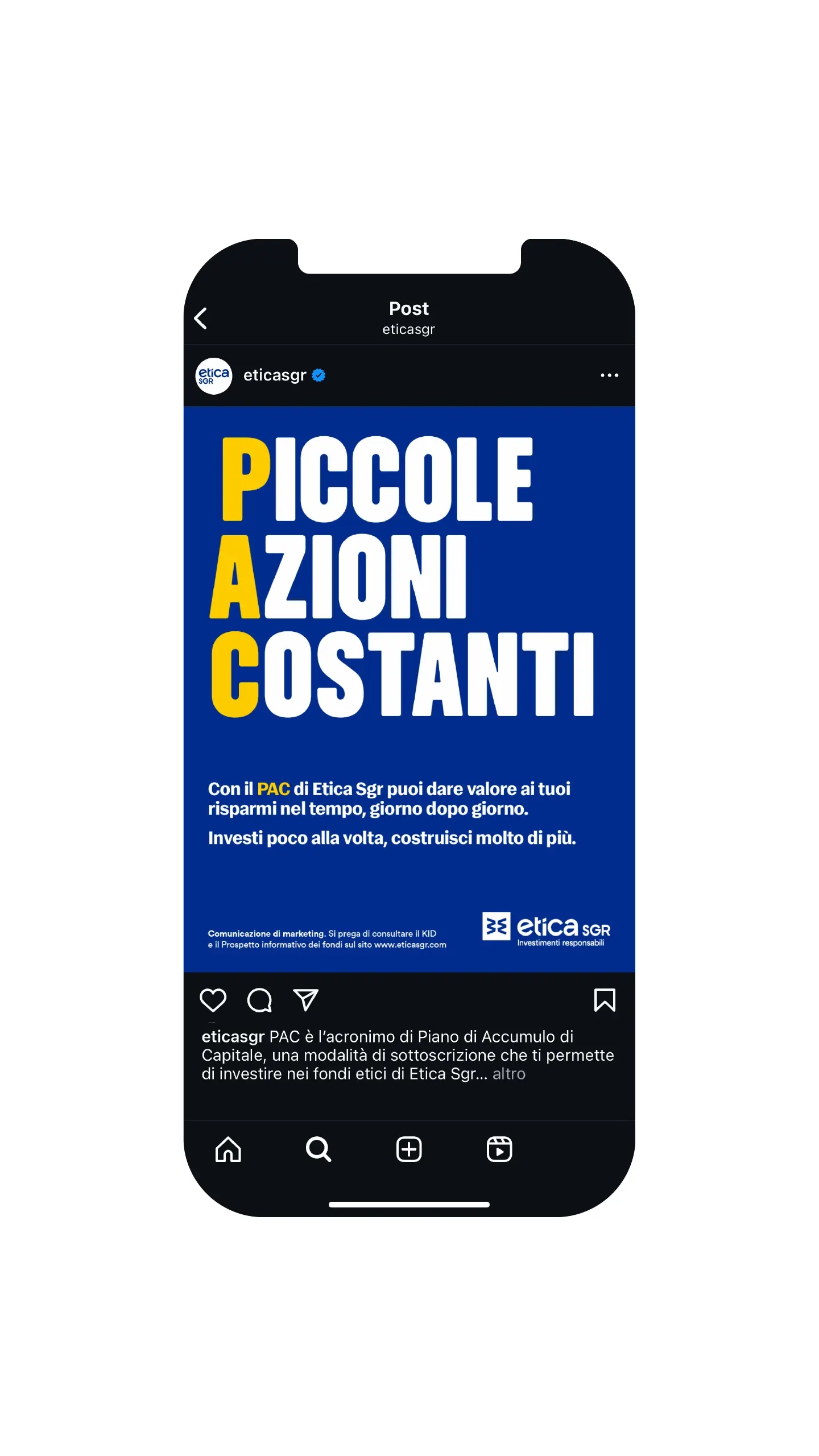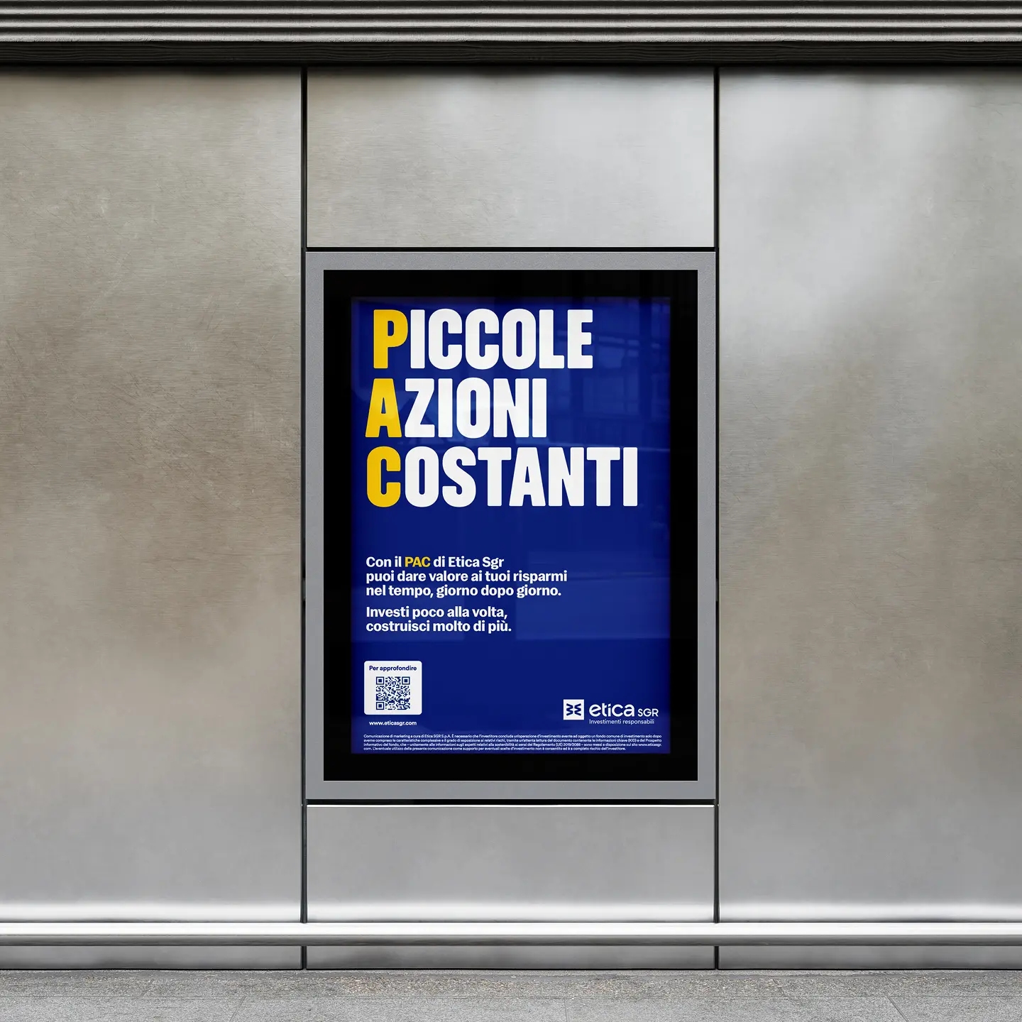 In occasione della campagna PAC 2025 di Etica Sgr abbiamo trasformato l’acronimo Piano Accumulo Capitale nel claim Piccole Azioni Costanti, che rappresenta l’essenza di questo strumento di risparmio: un impegno regolare, consapevole, che solo così permette ai soldi di crescere nel tempo.