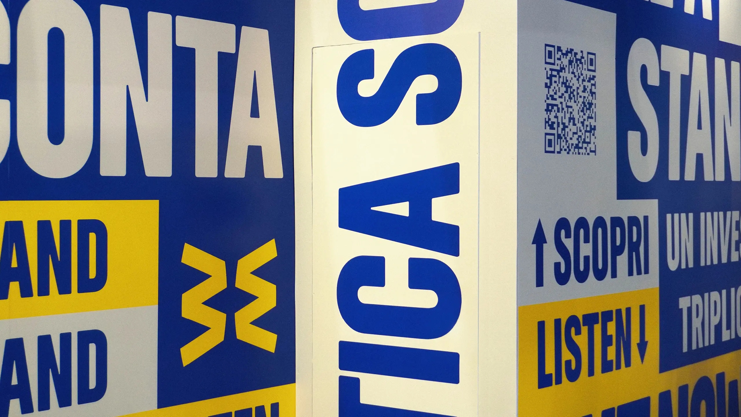 Questa scelta ha permesso di catturare l’attenzione in un ambiente affollato e visivamente variegato, rendendo lo stand di Etica Sgr immediatamente riconoscibile. Il risultato è uno spazio espositivo dove la tipografia non solo trasmette informazioni, ma diventa protagonista, traducendo i valori di Etica Sgr in un’esperienza visiva.