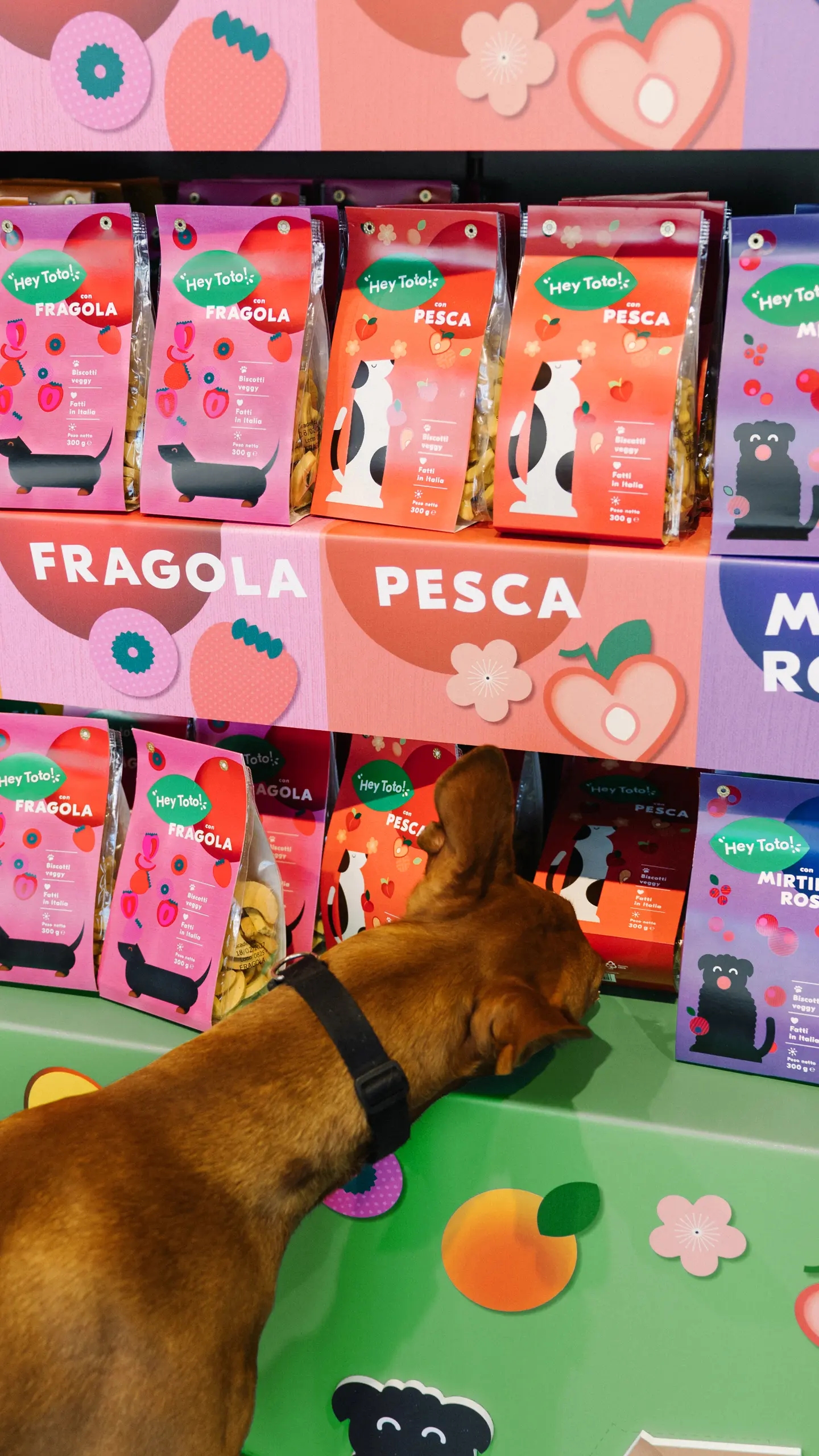 Il sistema visivo non si limita al packaging, ma si estende anche ai materiali di supporto e alla presentazione in store. I prodotti sono infatti esposti su uno scaffale personalizzato che riprende i codici visivi del brand, creando un piccolo universo colorato e coerente che rende immediatamente riconoscibile Hey Toto! a scaffale.