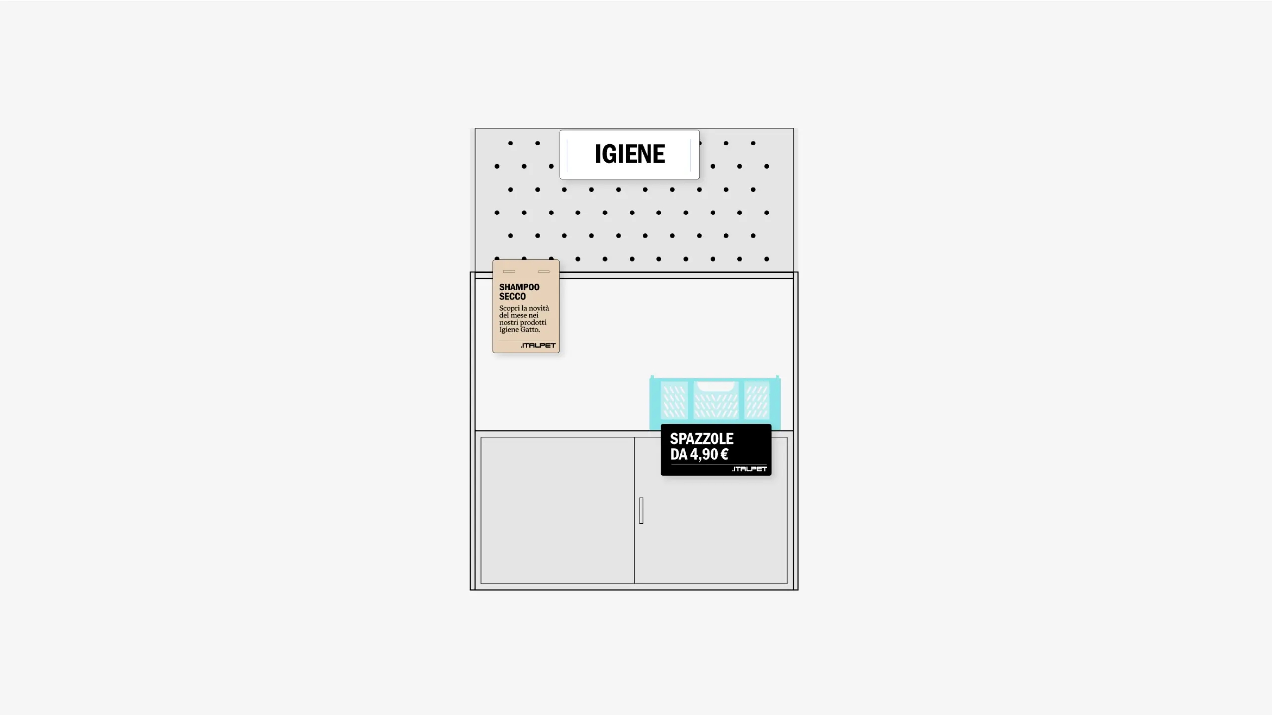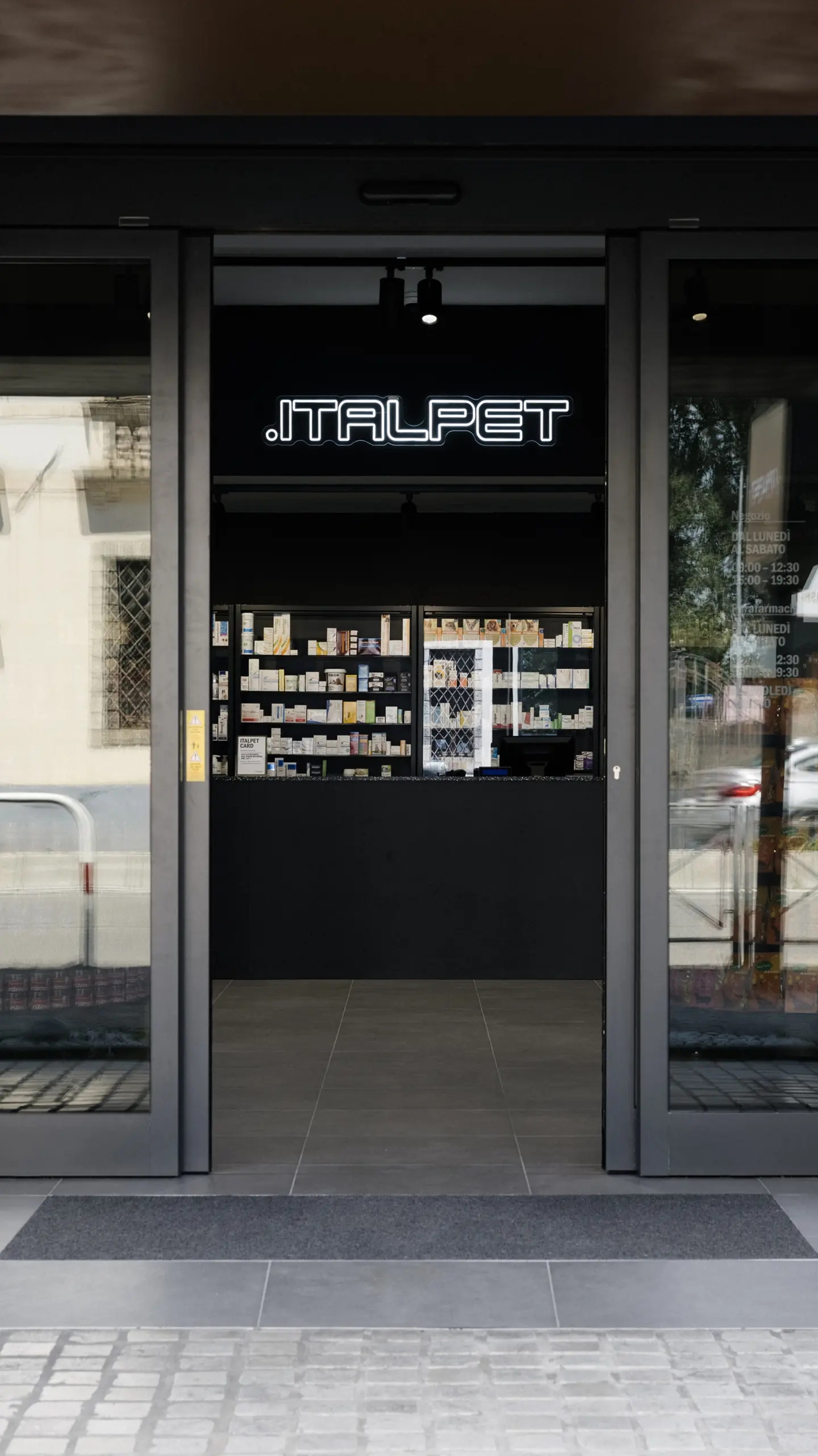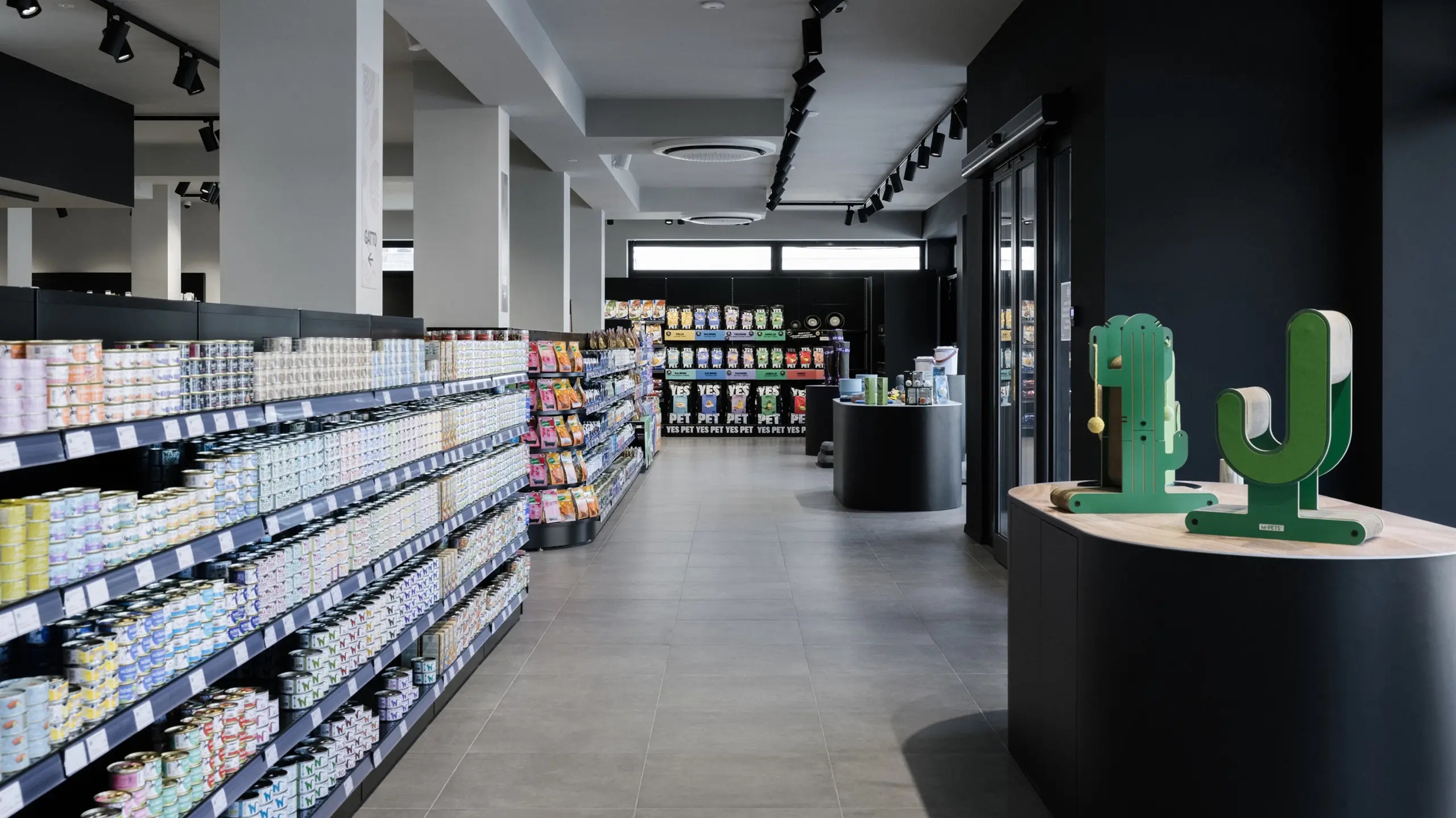 Il negozio, che si occupa della vendita di cibo e accessori per animali domestici, doveva rispondere sia a esigenze commerciali che di comunicazione, con un’attenzione speciale rispetto all’utilizzo di moduli già esistenti e alla scelta di materiali, finiture e colori in linea con l’identità visiva di Italpet.