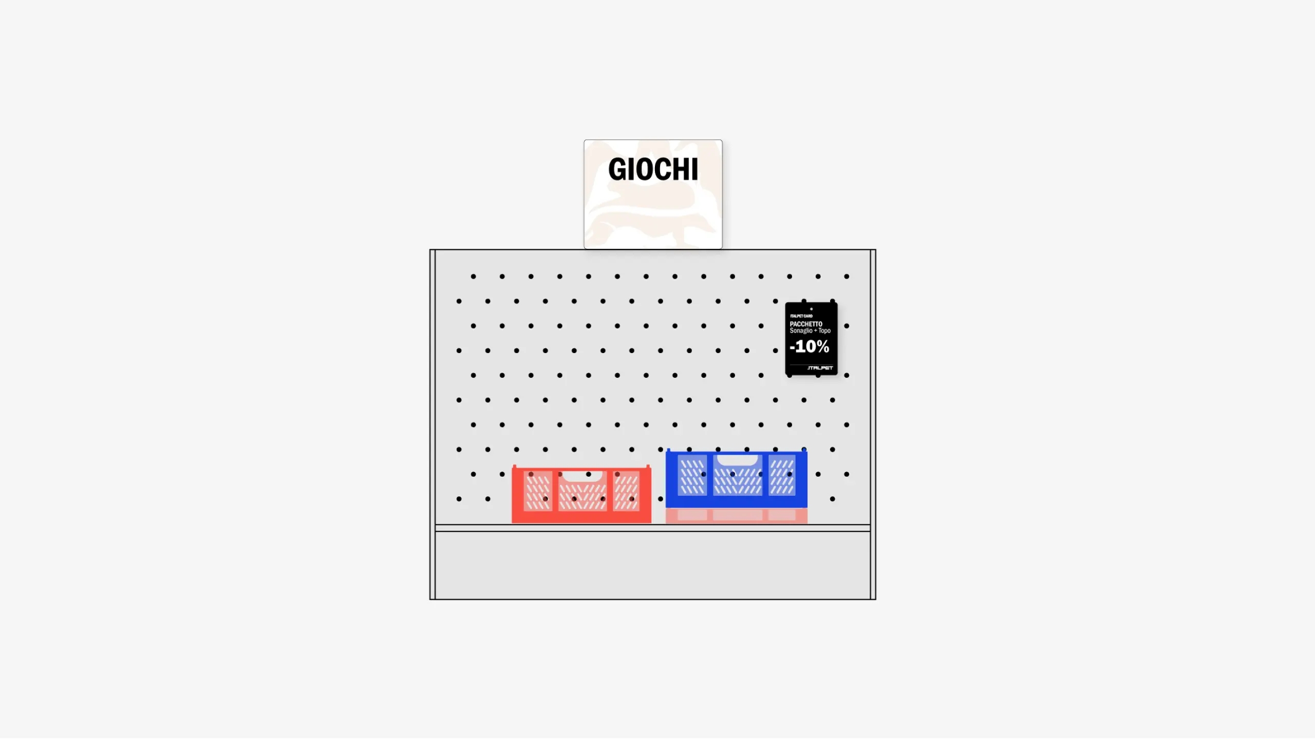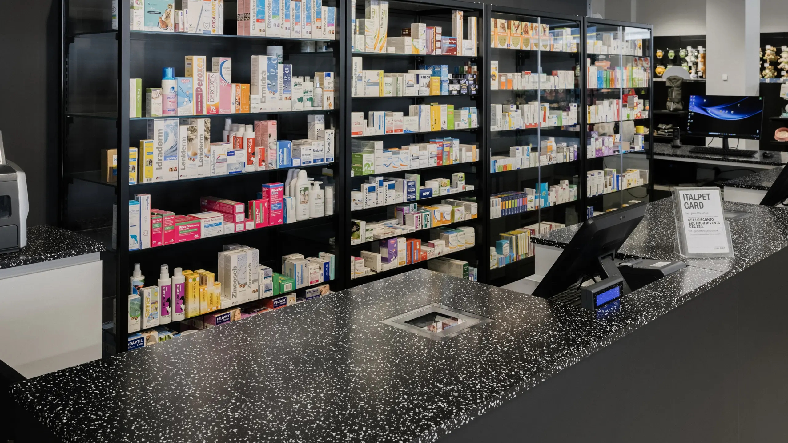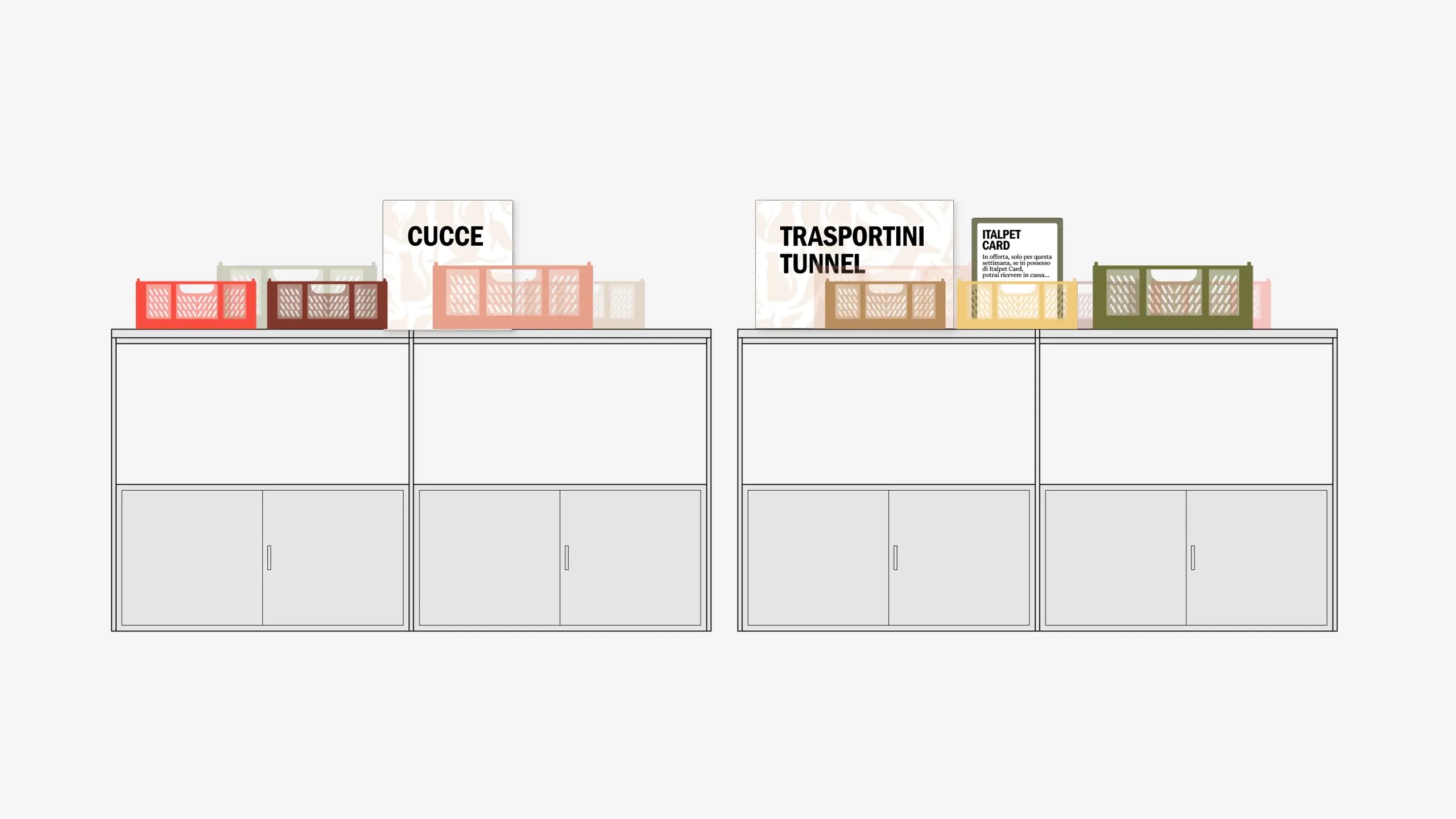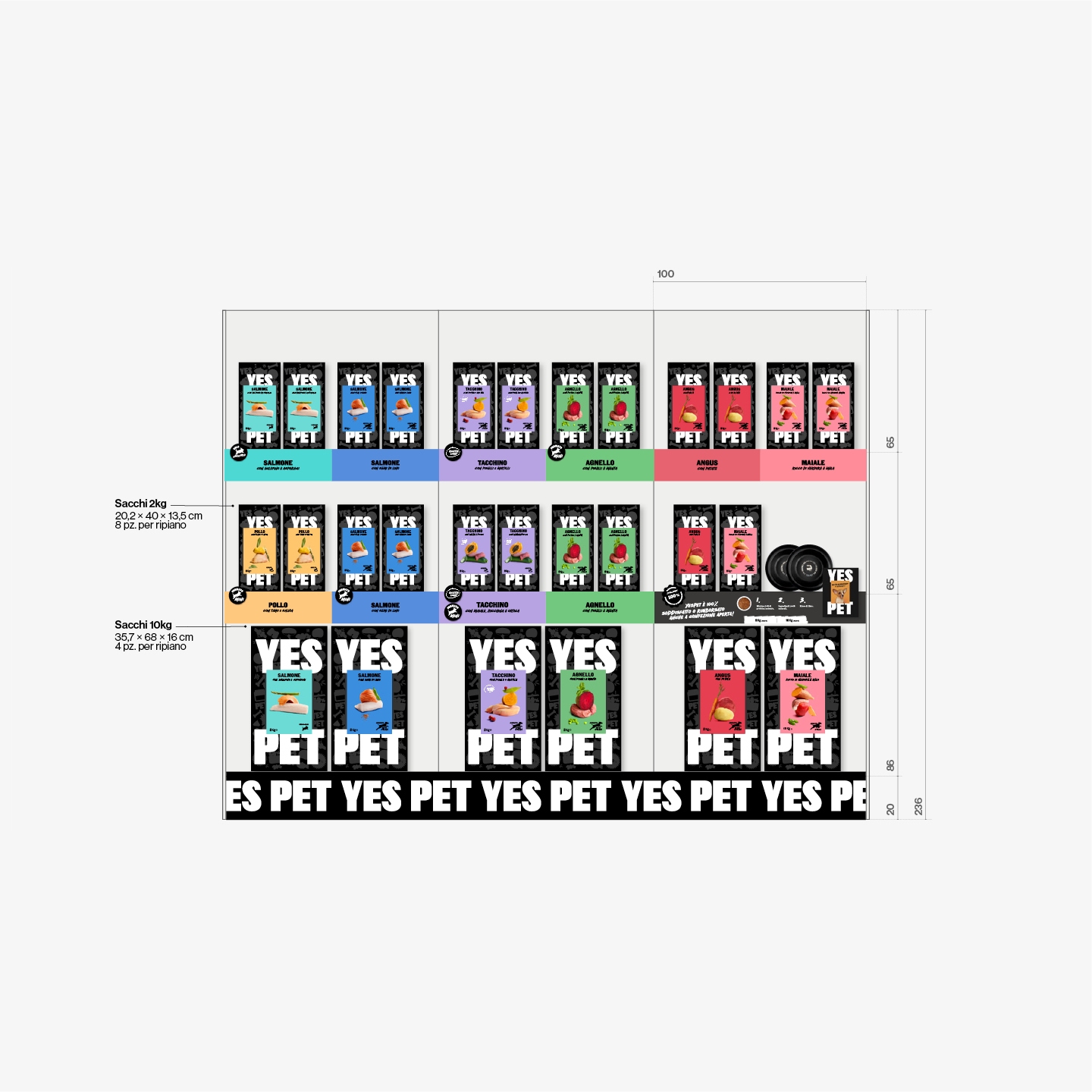 Il negozio, che si occupa della vendita di cibo e accessori per animali domestici, doveva rispondere sia a esigenze commerciali che di comunicazione, con un’attenzione speciale rispetto all’utilizzo di moduli già esistenti e alla scelta di materiali, finiture e colori in linea con l’identità visiva di Italpet.