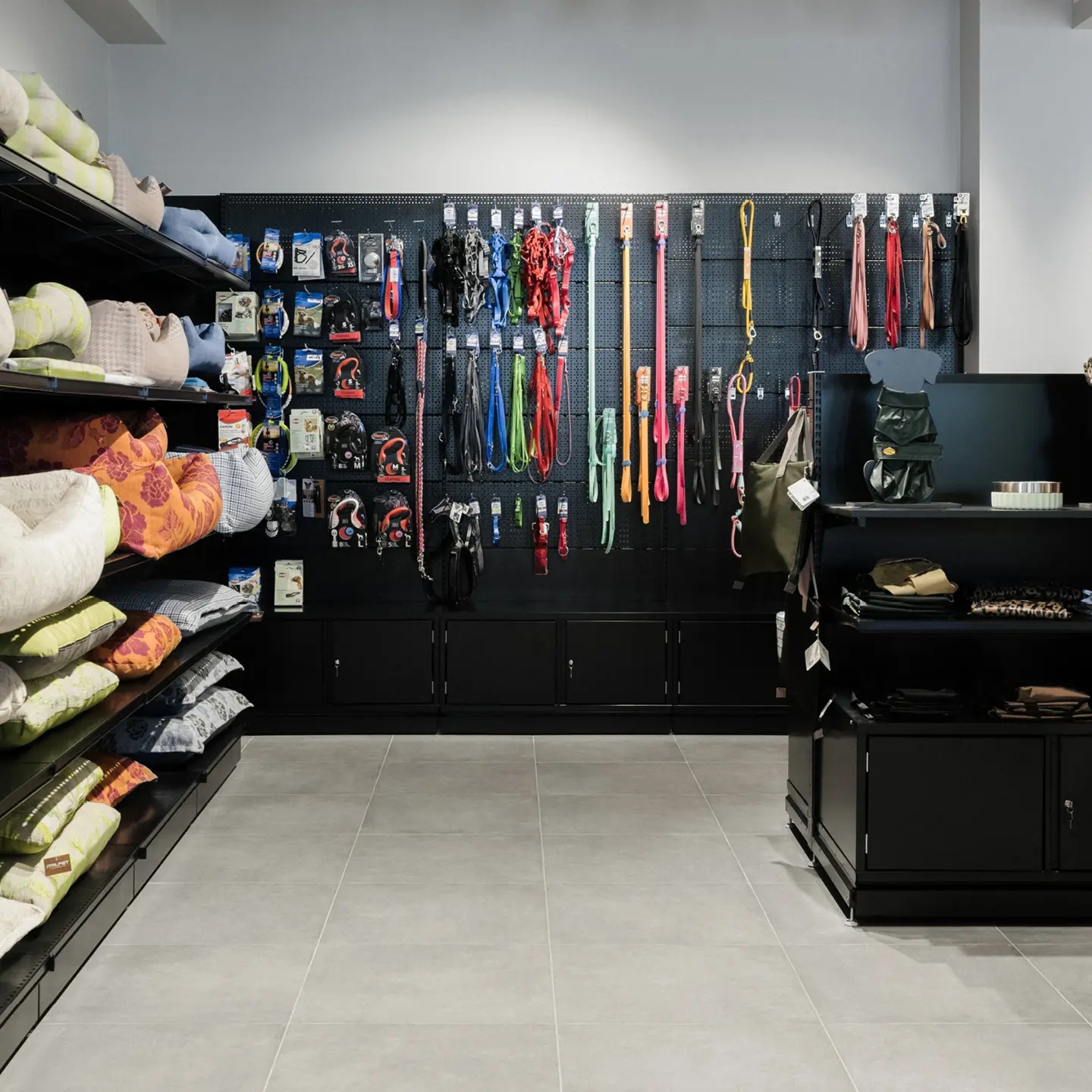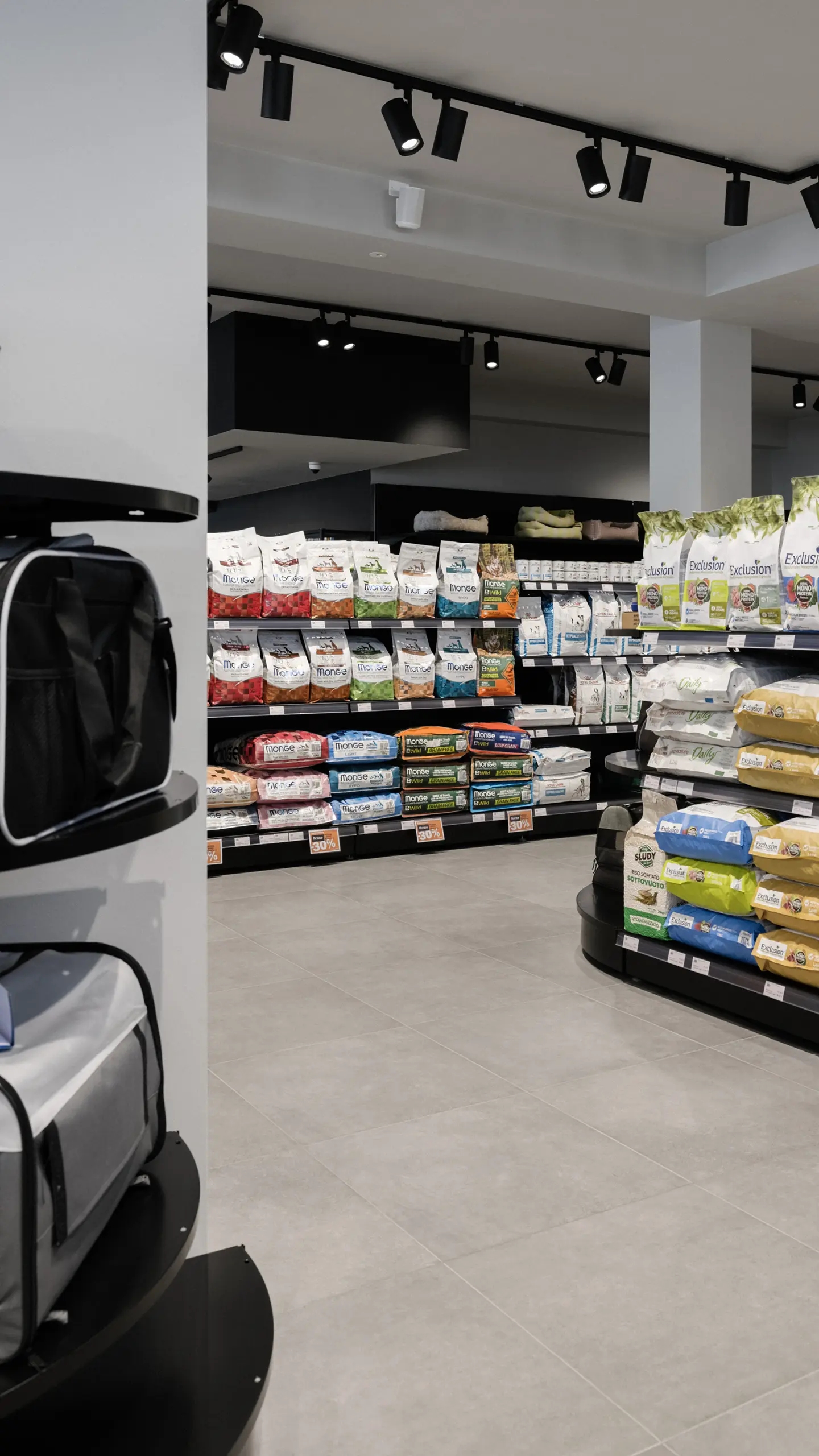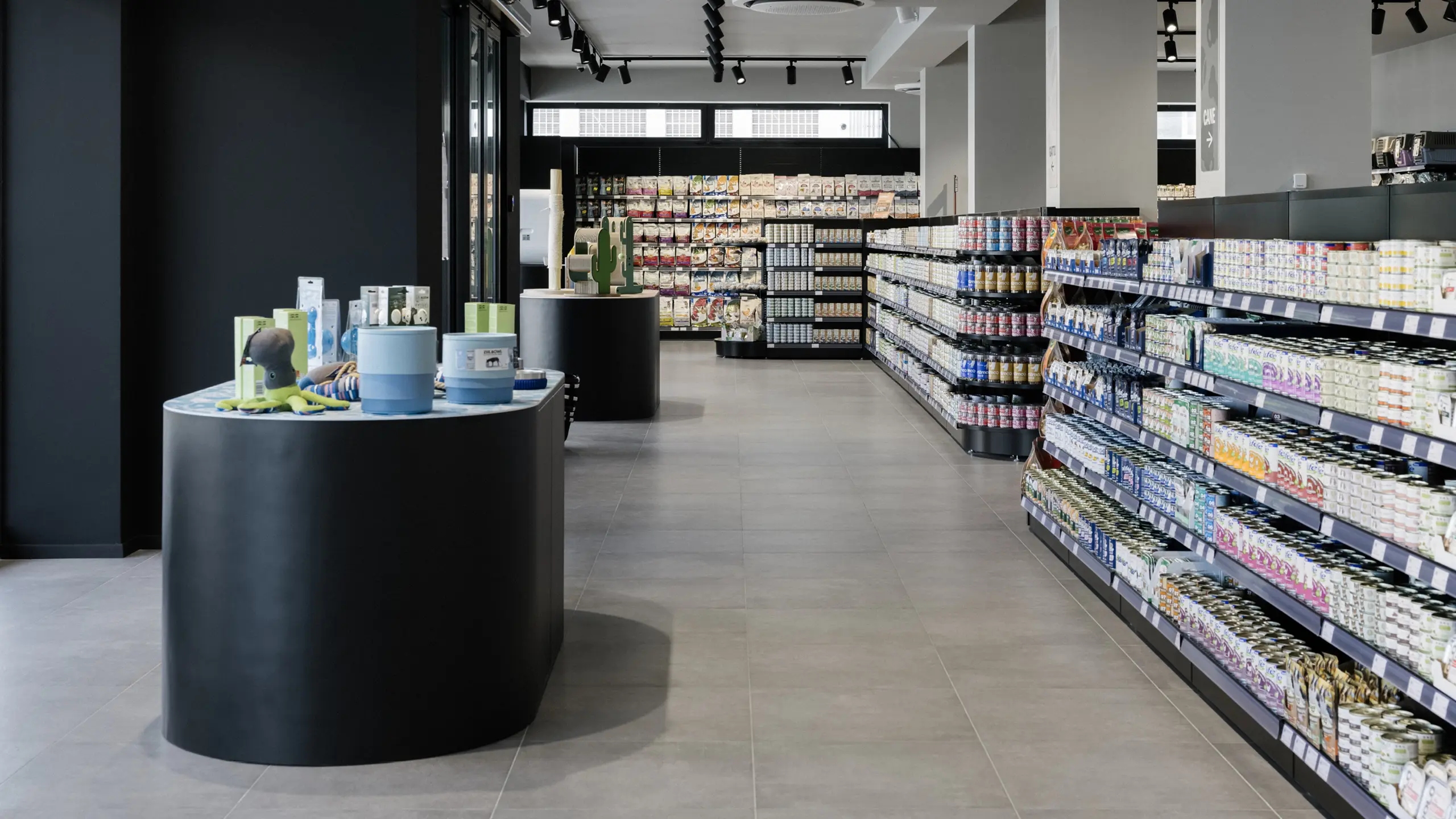 Il layout del negozio è stato pensato come un percorso obbligato, che guida i clienti lungo due sezioni distinte dedicate al mondo del cane e a quello del gatto. Questa divisione funzionale orienta facilmente l’esperienza di acquisto del cliente. Gli scaffali perimetrali, sviluppati in altezza, sono stati pensati per massimizzare lo spazio espositivo lungo le pareti. Quelli centrali, più bassi, garantiscono visibilità e continuità con l’intero store. I tavoli ovali in vetrina, invece, diventano superfici dedicate all’esposizione di articoli selezionati visibili anche dall’esterno.
