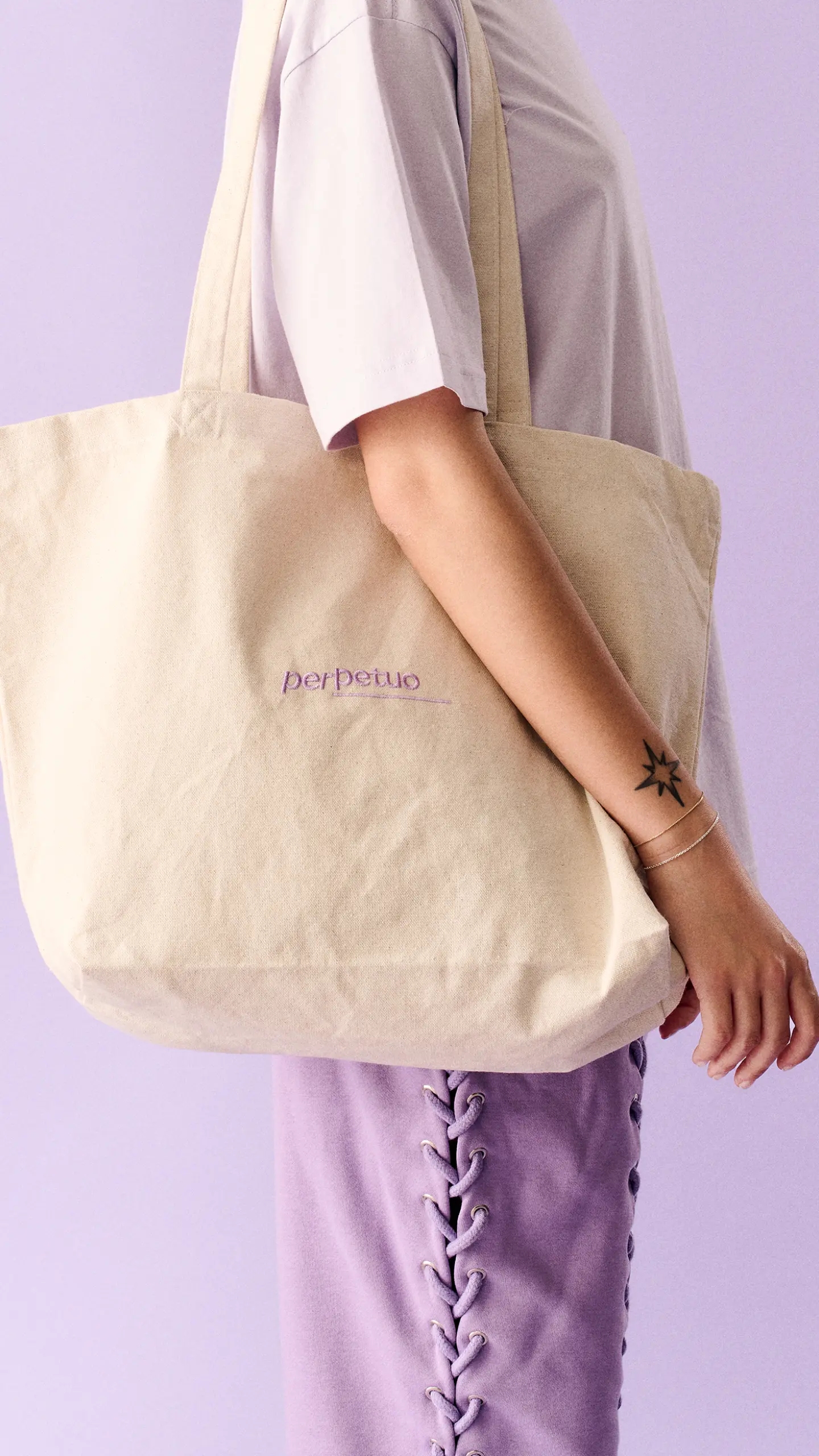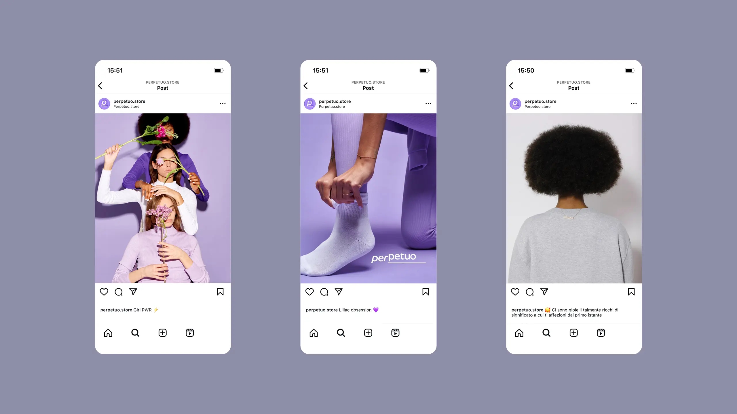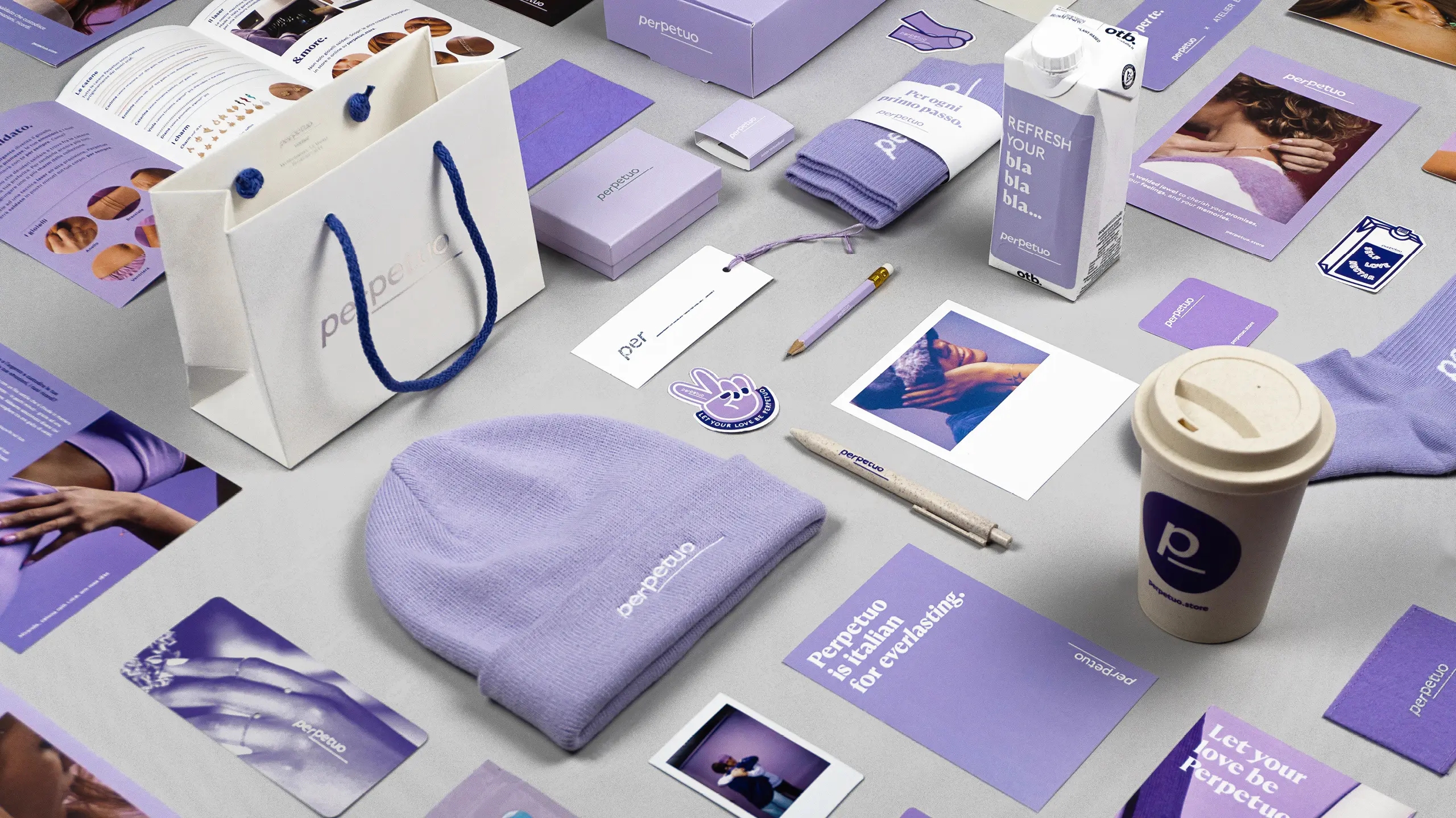 Per trasmettere l’unicità di Perpetuo, Sezione Grafica ha lavorato con un uso strategico e distintivo del colore, con l’intento di rendere immediatamente riconoscibile il brand. Il lilla è stato scelto come colore centrale, per la sua natura fluida, senza genere e senza stagione. Questa scelta cromatica è potenziata da un effetto olografico, che aggiunge una dimensione digitale, rafforzando l’identità visiva con un elemento contemporaneo.