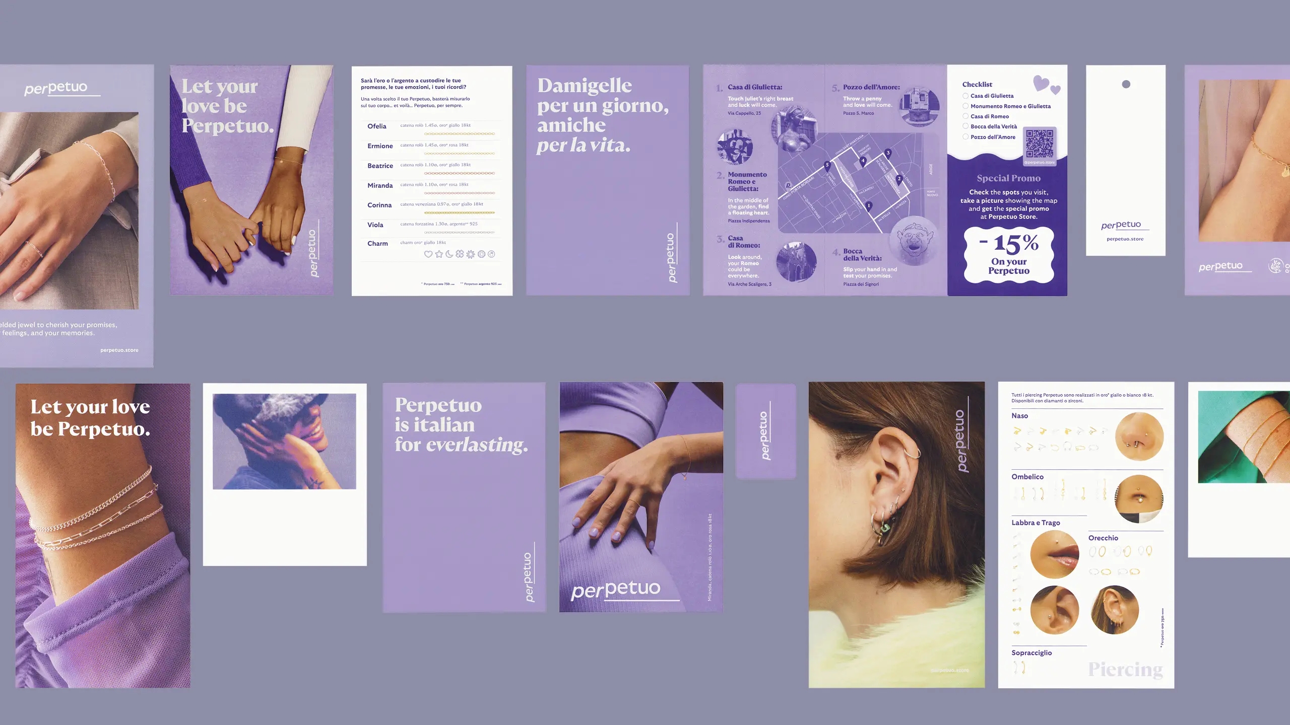L’identità di Perpetuo si costruisce su slogan incisivi e immagini fotografiche emozionali, pensati per rispecchiare l’idea del gioiello. Grazie alla scelta cromatica totalizzante e alla tipografia distintiva, Sezione Grafica ha ideato un’identità flessibile, capace di adattarsi a diversi supporti e applicazioni. Il brand diventa immediatamente riconoscibile su materiali digitali e fisici, trasmettendo il messaggio di Perpetuo con coerenza.