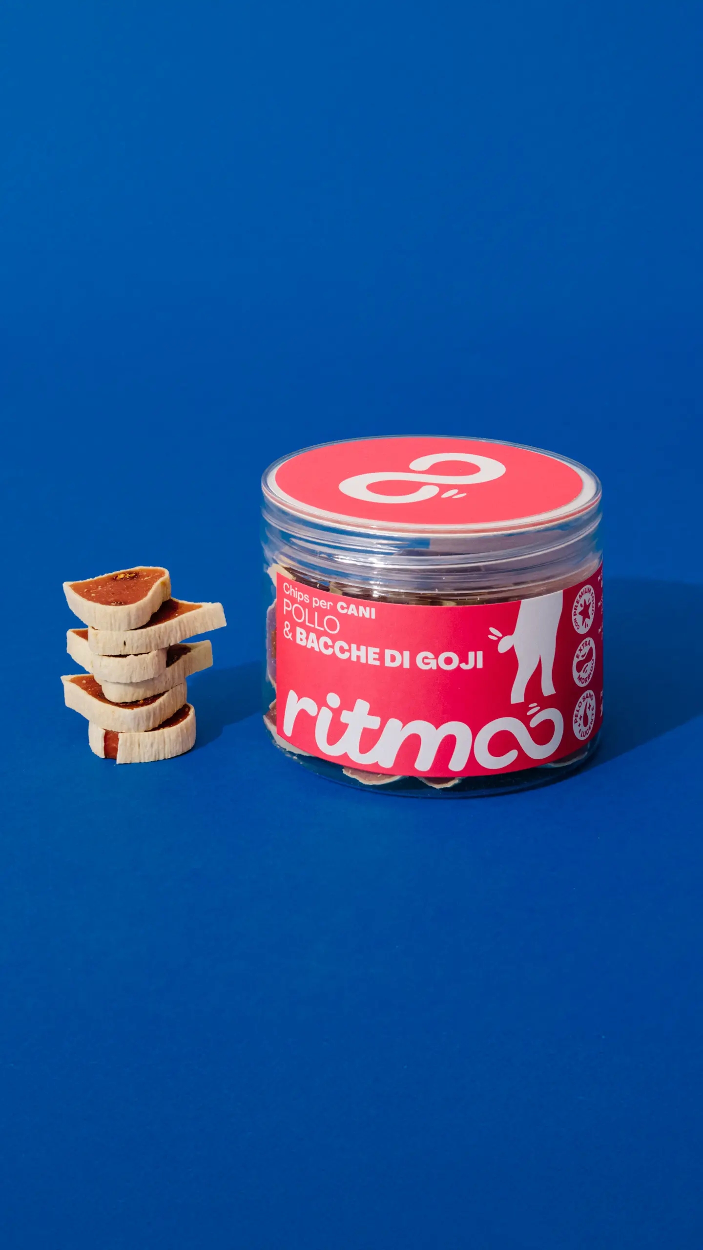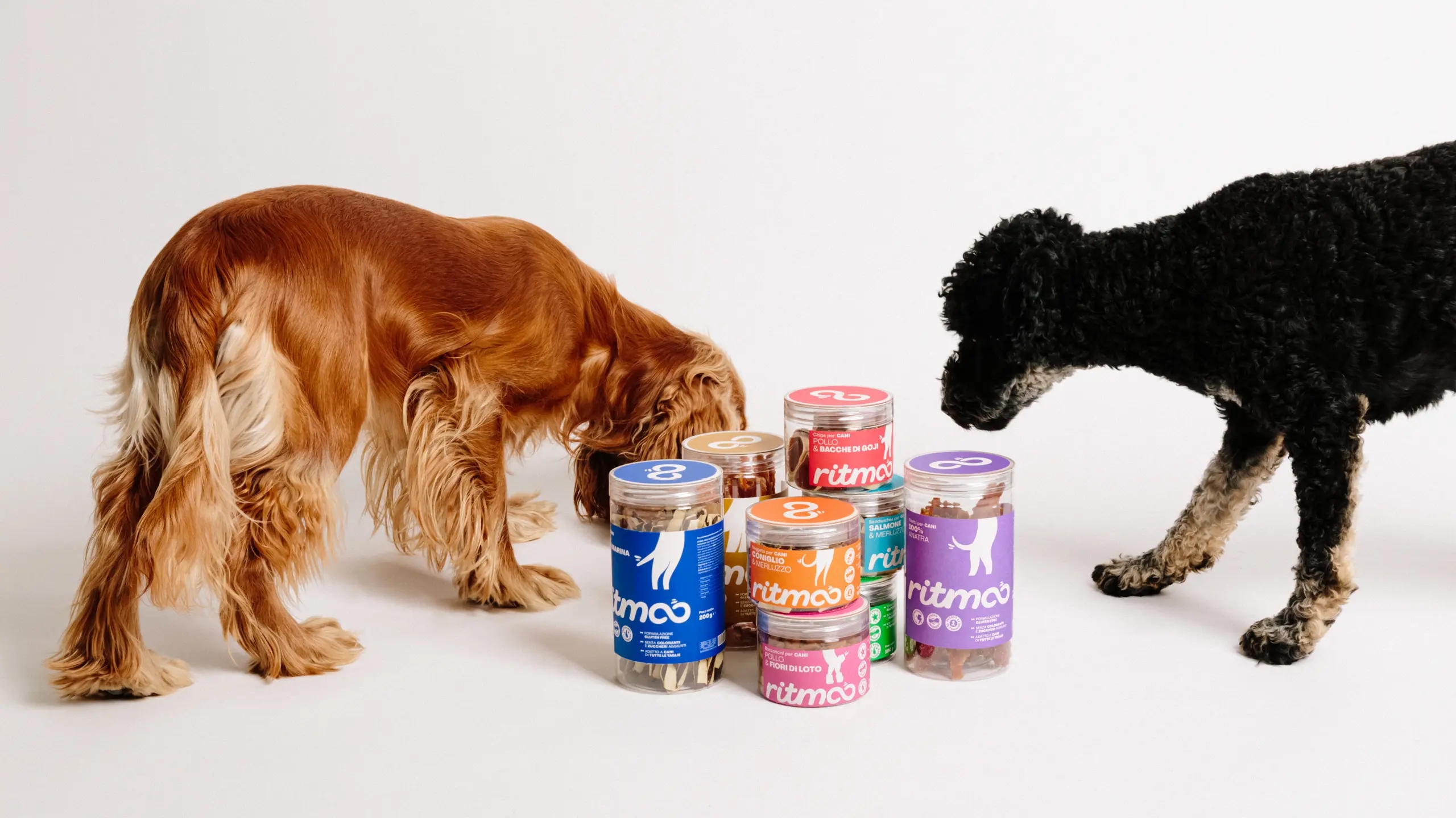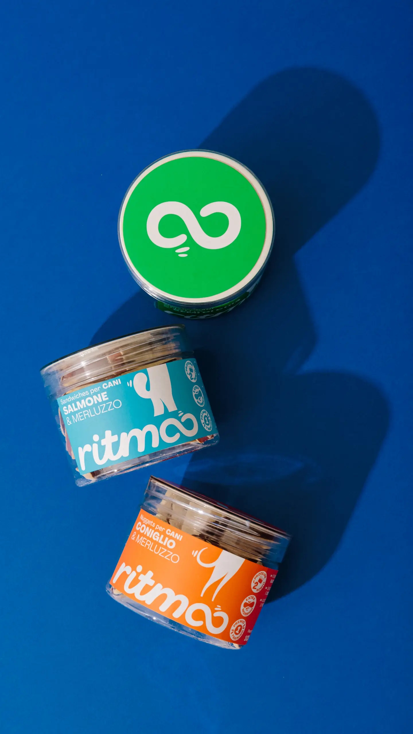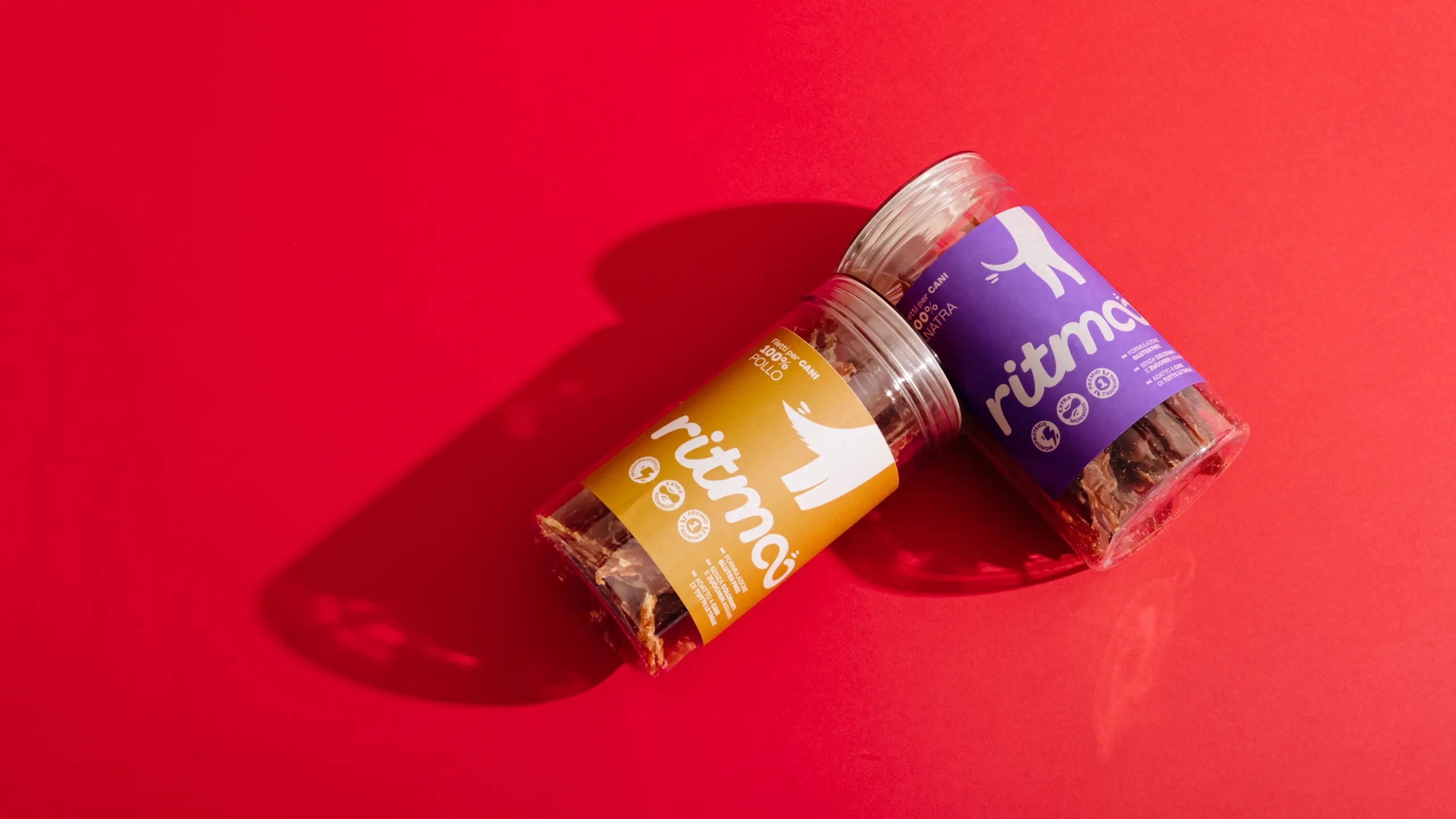 Sezione Grafica si è occupata del naming e dell’identità visiva di Ritmoo, una linea di snack per cani di alta qualità. Il nome “Ritmoo” richiama il suono degli snack nel barattolo che attira immediatamente l’attenzione del cane, creando un’associazione giocosa e dinamica con l’atto di scodinzolare “a tempo di snack”, payoff del brand.