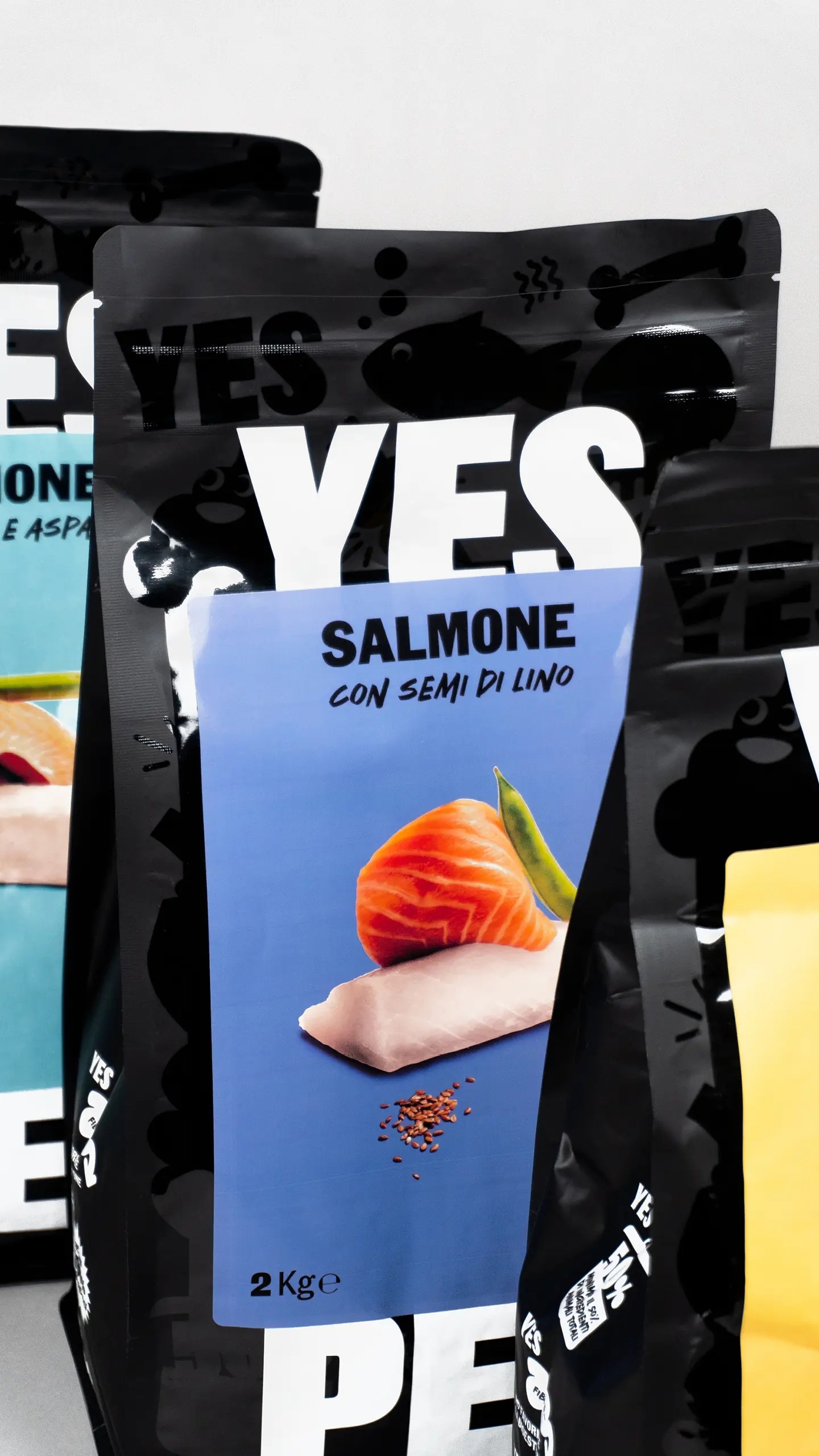 Sezione Grafica ha progettato l’identità visiva e il packaging per YESPET, marchio petfood di alta qualità, con l’obiettivo di disegnare un brand capace di emergere sullo scaffale del negozio, solitamente dominati da confezioni sovraccariche di informazioni. L’idea progettuale è quella di un brand che spieghi chiaramente sul sacco le caratteristiche fondamentali del prodotto e che aiuti il cliente ad orientarsi nella scelta. La semplicità delle informazioni in primo piano e la forza visiva del sacco permette ai clienti di capire facilmente il prodotto e di ricordarlo nel momento in cui si acquista una seconda volta.